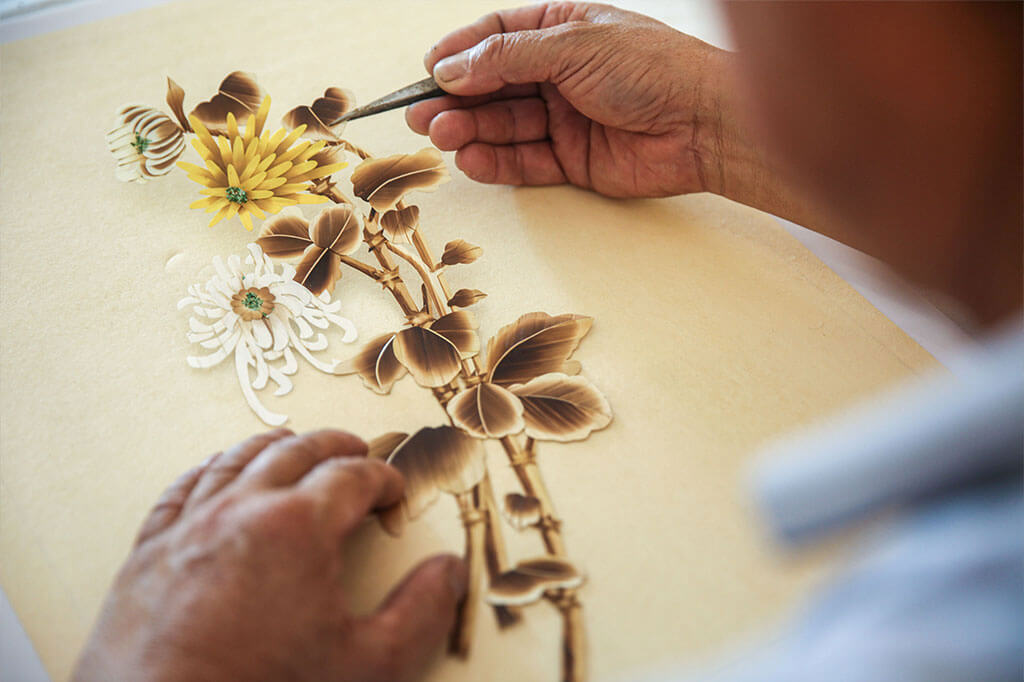 麥草畫始于隋唐時代的宮廷工藝品,是以麥秸稈為造型原料,運用麥稈的自然光澤和紋理、質地,創造性融入國畫、油畫等諸多技術技法,經過熏、蒸、漂等三十多道工序純手工制作而成。2011年,泊里“麥草畫”入選“國禮作品選”,2018年被確定為上合青島峰會國禮贈送各國領導人。
